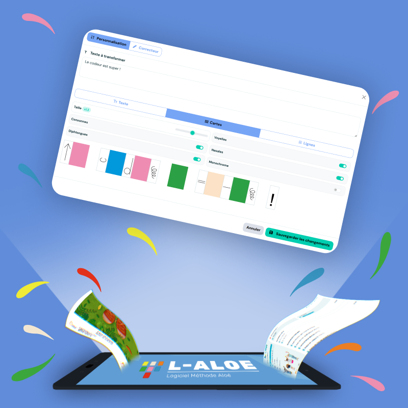 Grâce à un outil de codage intelligent, vous pouvez désormais créer vos propres documents codés en Aloé directement dans l’application : textes, jeux, exercices, etc.