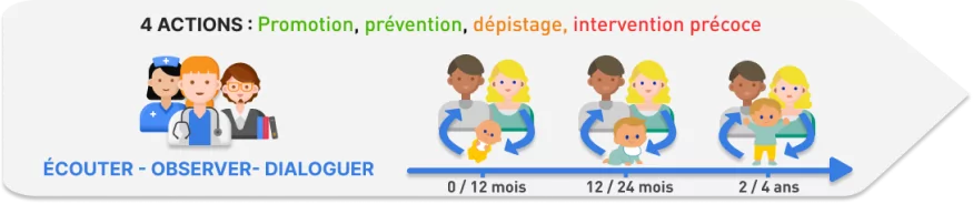 Soutenir l’action des professionnels dans la prévention et le dépistage des risques et accompagner les familles en faisant de la communication et du langage un sujet central et crucial.